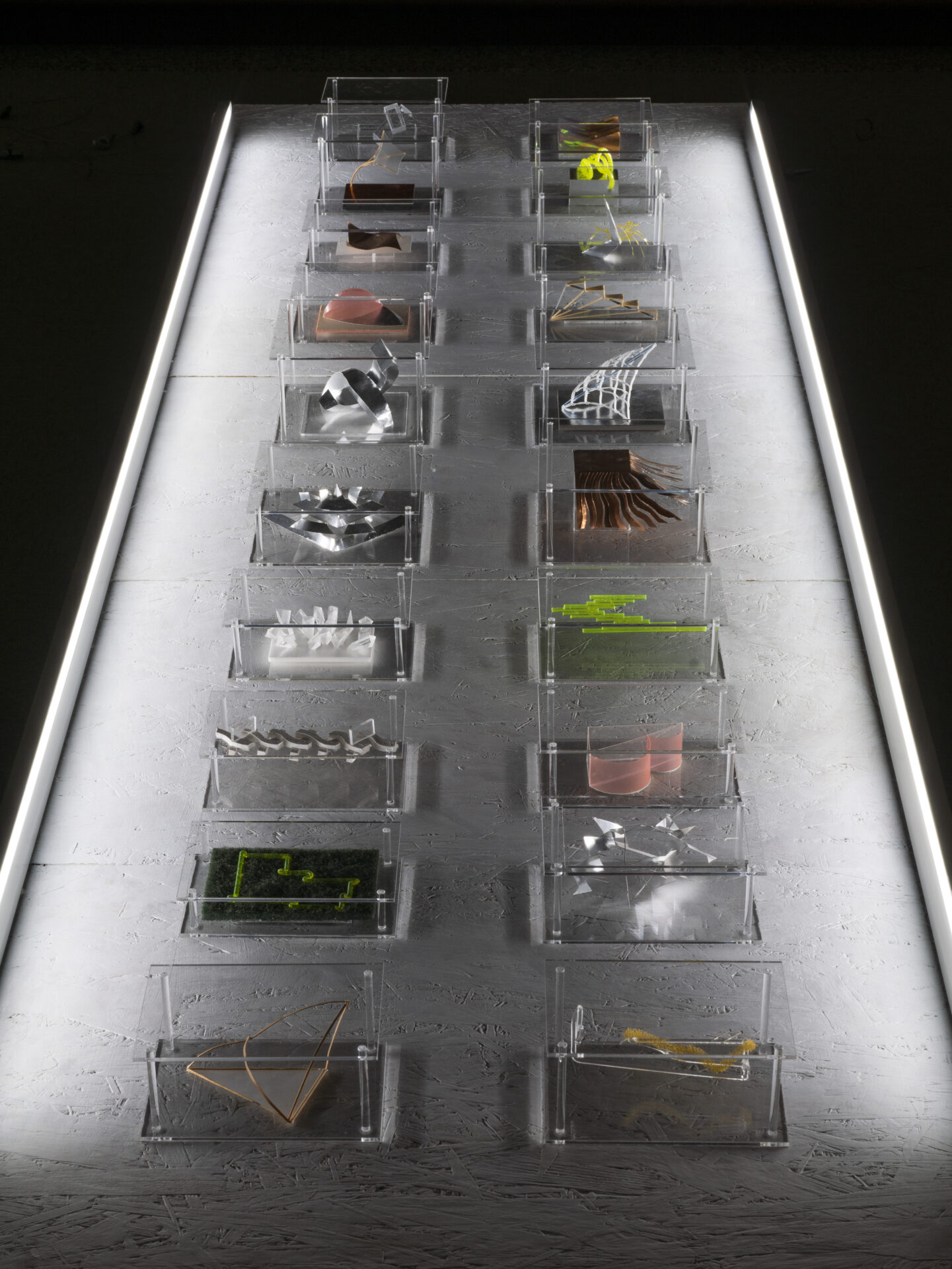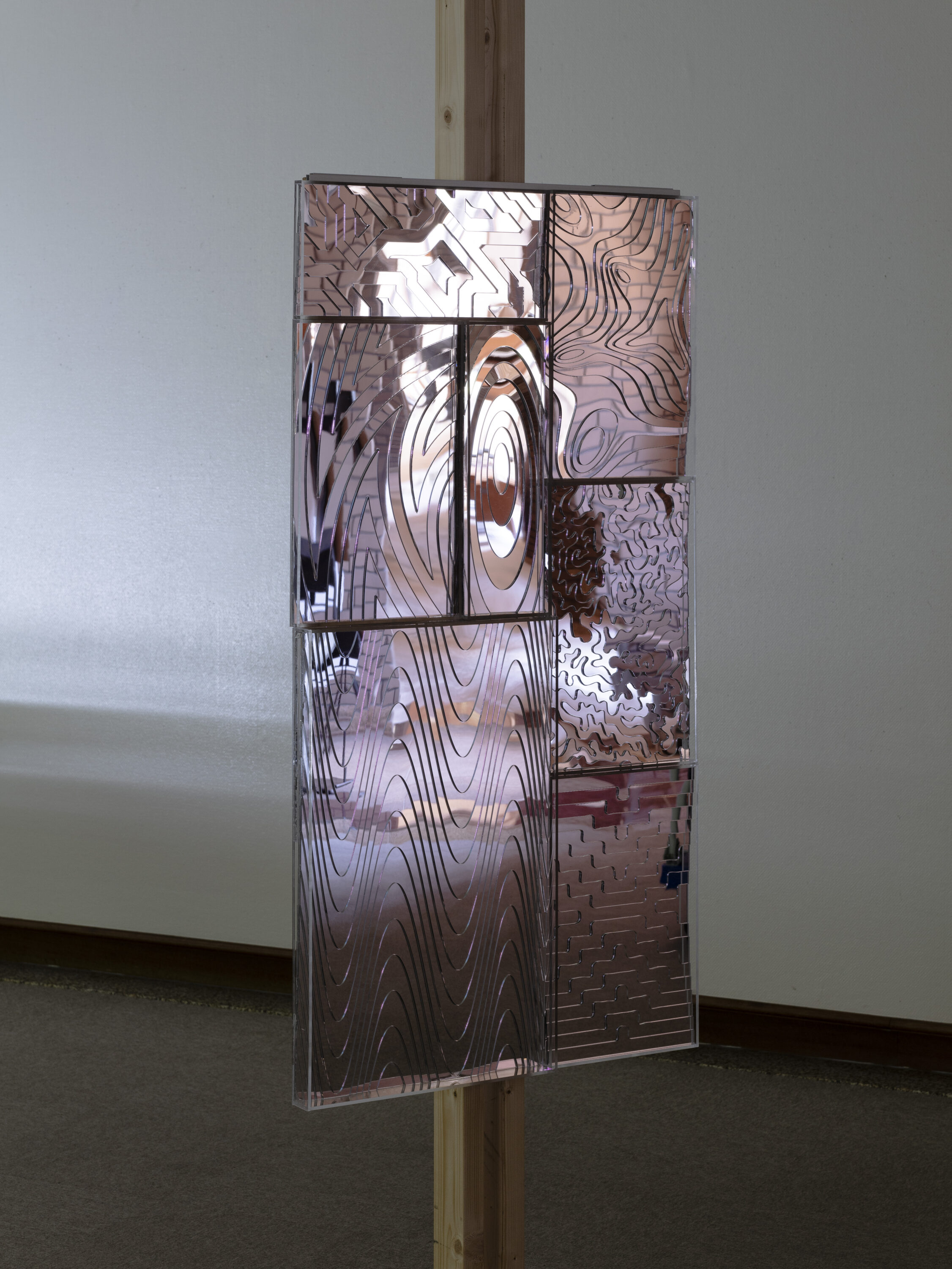 夢と現実では時空が歪み入り組んでみえる。目が覚めるまで夢を見ていることに気付くこともない。日々聴こえてくる音、香り、触れた感触は意図せず迫ってくる無意識の夢のよう。意識と無意識が混ざる微かに屈折した時空は感覚的に大きな歪みになり得る。その夢のような感覚を記憶するため立体作品に立ち上げ眺めていると、その時空に立ち帰ることができるように思う。モノとして残すことは感覚を記憶するため、意識の杭を打とうとする行為なのかもしれない。そのモノたちは現実空間においてどこか違和感をまとい、屈折した像のように感じる。屈折には始点があるように、自ら思い描いた像はどこを軸に歪んでいったのか。原風景を辿るべく、生まれ育った故郷にある稲沢市荻須記念美術館第Ⅱ展示室に作品を配置して眺めてみた。