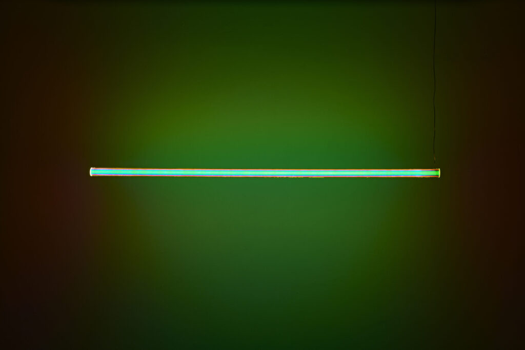 光の三原色―赤、青、緑―が組み合わさった白色光源を再び分節する偏光処理を施し、観る角度によって光色が切り替わる光の作品。物として触れられぬ光ではあるが、この偏光という現象を概念的に切削と捉えれば光の彫刻とも言えよう。もっとも色の差異は、発光体のみならず、照らされた物の背面に現れる影にも視えてくる。